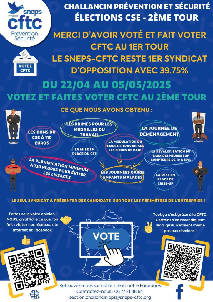 Du 22avril au 5 mai 2025, votons et faisons voter pour les bleus de la CFTC (aucun nom à sélectionner, il y a juste à valider la liste entière).